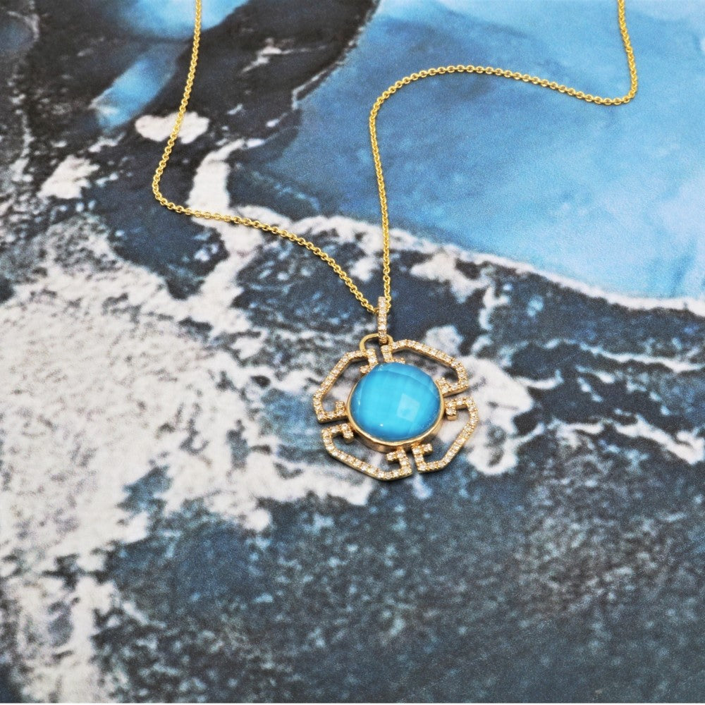 Beautiful Hand Crafted 14K Yellow Gold 10MM Turquoise And Diamond Essentials Collection Pendant